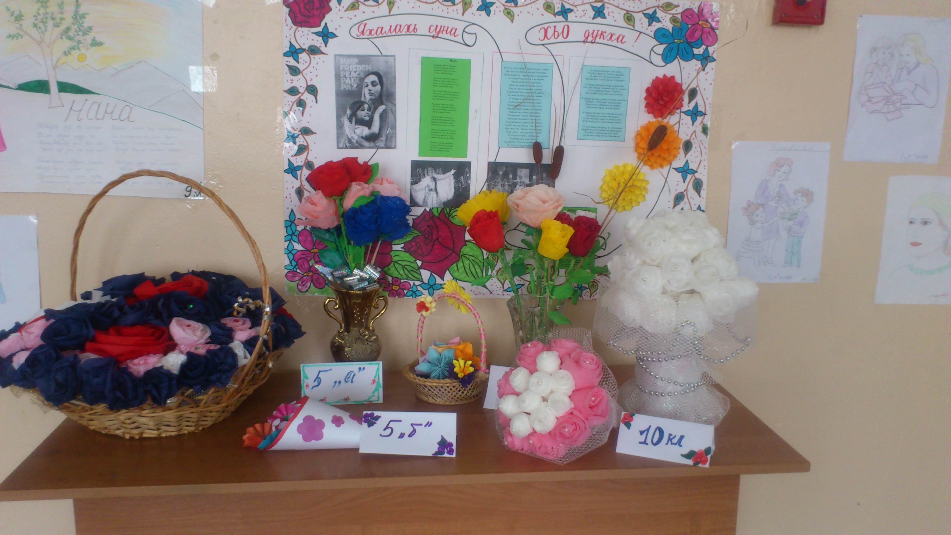 Согласно приказу Министерства образования и науки Чеченской Республики «О проведений мероприятий, посвященных Дню матери и общешкольного плана с целью формирования у учащихся уважительного отношения к матери, почитания и соблюдения национальных обычаев и традиций в течении недели (с 24.11.14. по 29.11.14.) в рамках мероприятий, посвященных Дню Матери под девизом: «Дуьненан къинхетам, Нана!» были проведены следующие мероприятия: встречи с известными женщинами села- матерями героев, многодетными матерями; женщинами-руководителя ми учреждений села, учителями; тематические классные часы, беседы; утренник для младших школьников; конкурсы стихов и песен (с 5 по 11 кл.); конкурсы рисунков (с 1 по 8 кл.) и плакатов (с 5 по 11 кл.), конкурс сочинений (с 2 по 11кл.); конкурс букетов; выставка детских поделок «Мир вокруг нас», «Портрет матери»; диспут среди старшеклассников; стенды «Наши мамы», «Портреты любимых мам»; родительские собрания матерей; встречи со старейшинами и имамом села по вопросам нравственности, воспитания у детей уважительного отношения к матери; спортивные мероприятия, праздник для мам.